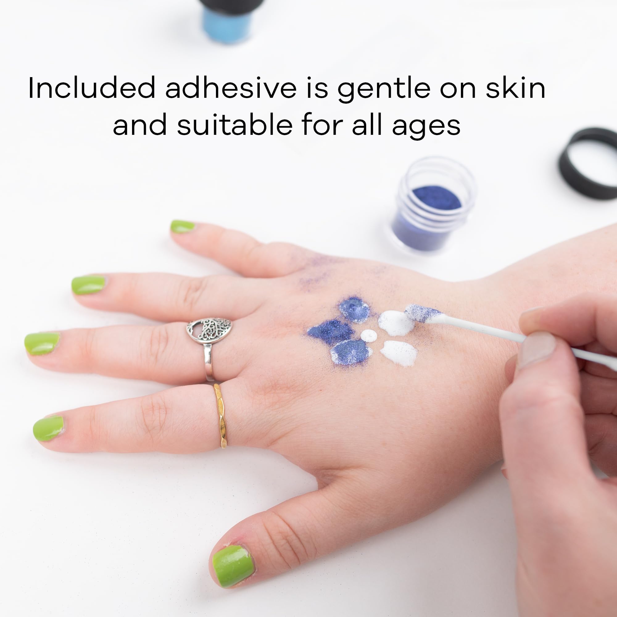 - Safe to Use - The included glitter tattoo glue is gentle on skin and suitable for all ages. We recommend testing a small section of skin and waiting 24hours for any reaction before applying a full design. The glitter is fine and won't scratch or irritate the skin